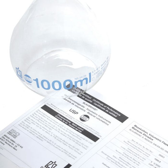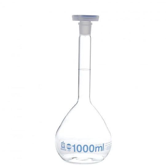 No reviewsMatraz volumétrico 1000mL.Tolerancia ±0.30mL.Clase A DIN USP; incluye certificado por lote USP.Fabricado en vidrio de borosilicato (Boro 3.3).Ajustado por contenido 'In'.Tapón de polipropileno; esmerilado 24/29.Precio regular $1,380.00Precio regular $1,380.00 -