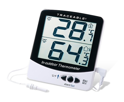 Termómetro digital con sonda plástica para interior y exterior con certificado trazable a NIST, es ideal para monitorear al mismo tiempo la temperatura ambiente y la temperatura de la sonda al interior de congeladores, refrigeradores cuartos limpios, campanas entre otros. Con funciones de: alarma, de máximos y mínimos. Tiene carcasa plástica de ABS resistente. Con calibración multipunto en el laboratorio de calibración ISO / IEC 17025:2005 acreditado por A2LA e incluye un certificado trazable numerado individualmente que garantiza la precisión.